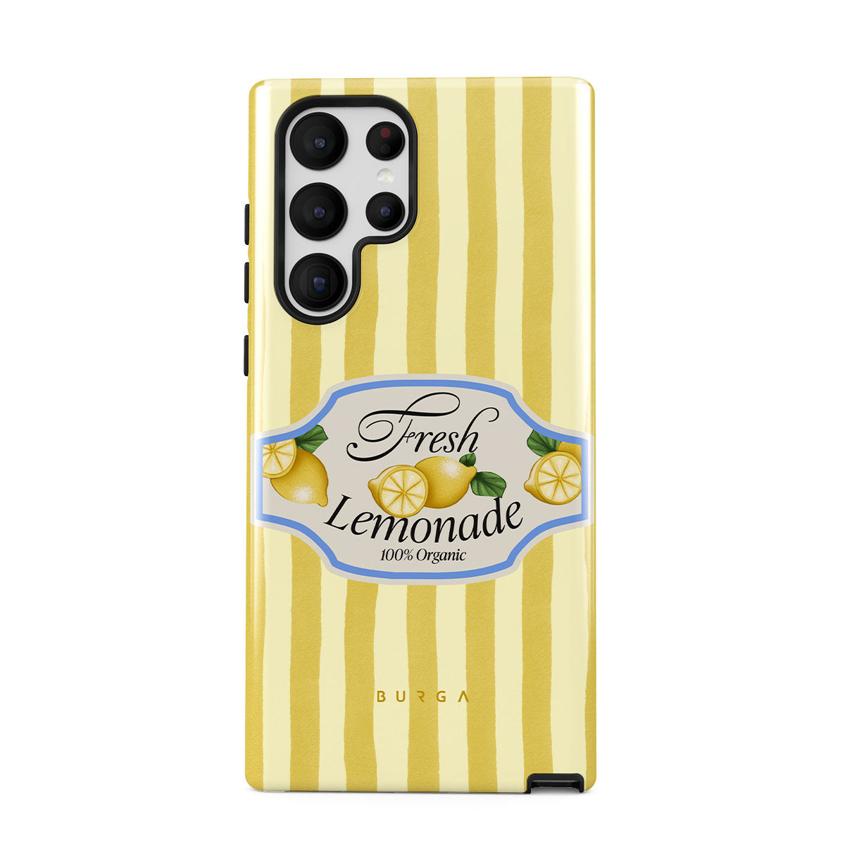 此設計特色:檸檬、黃色條紋、俏皮的圖形