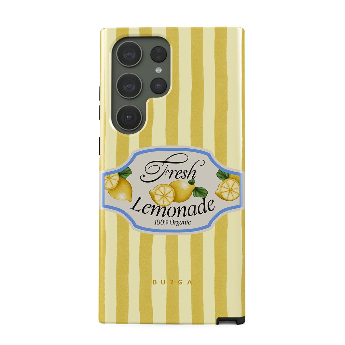 此設計特色:檸檬、黃色條紋、俏皮的圖形