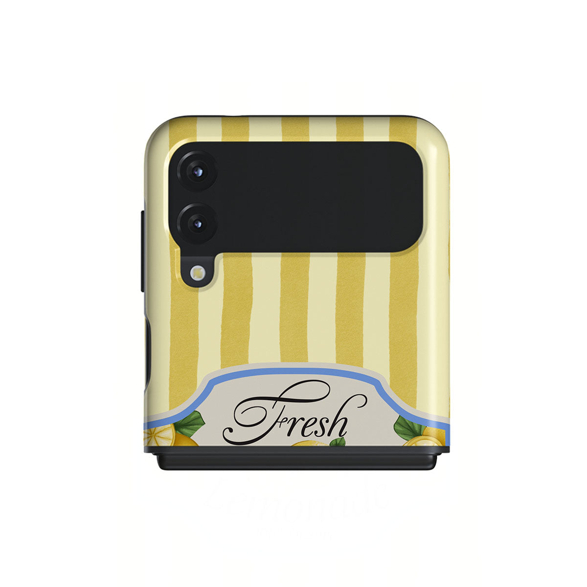 此設計特色:檸檬、黃色條紋、俏皮的圖形