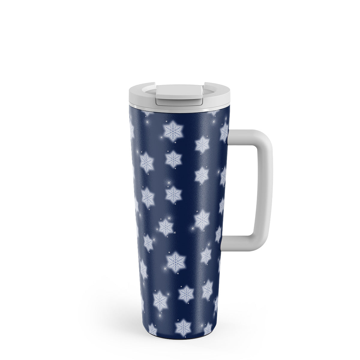 此設計特色:白色雪花,深藍色背景,冬季雪花圖案,幾何雪花,經典冬季設計
