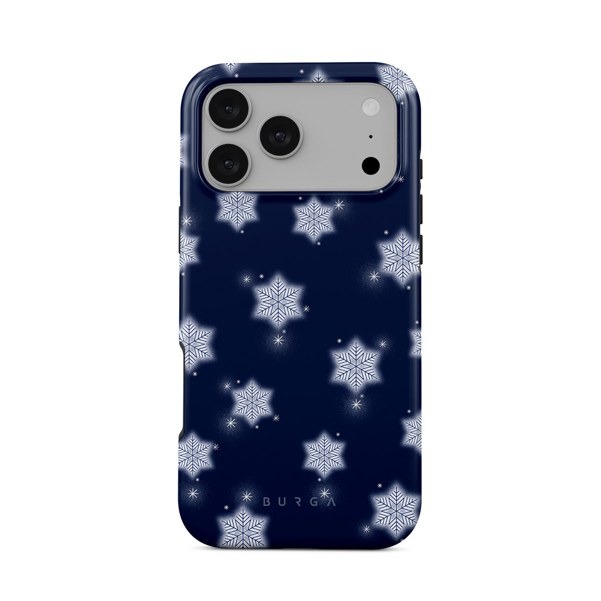 此設計特色:白色雪花,深藍色背景,冬季雪花圖案,幾何雪花,經典冬季設計