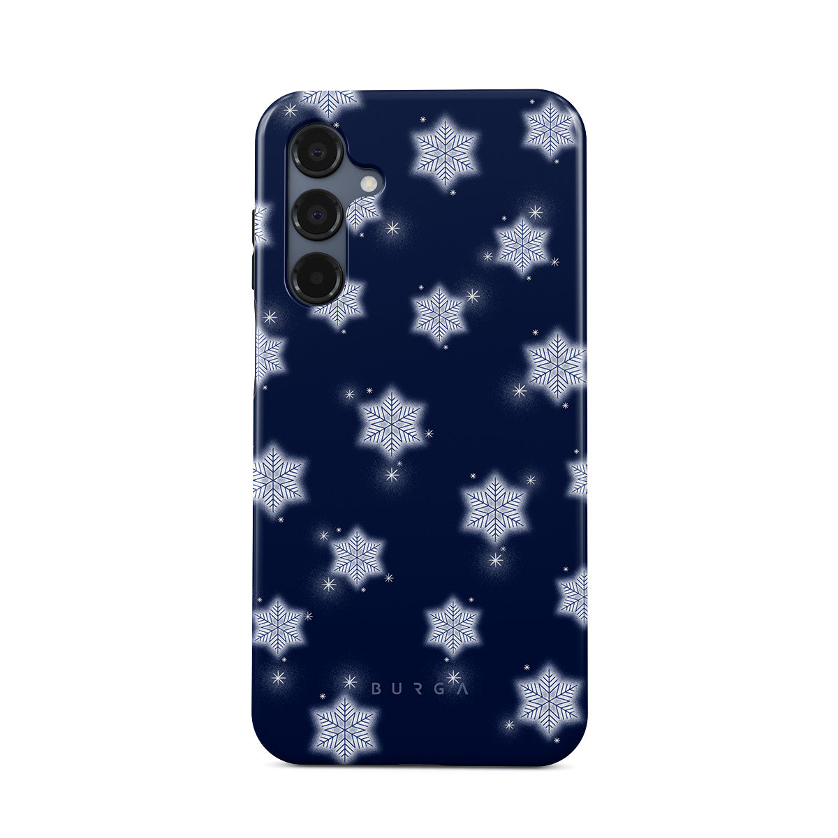 此設計特色:白色雪花,深藍色背景,冬季雪花圖案,幾何雪花,經典冬季設計
