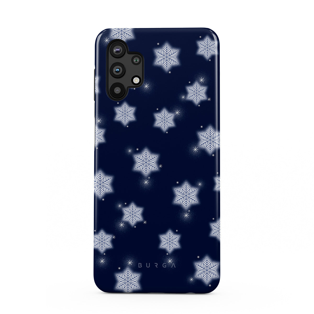 此設計特色:白色雪花,深藍色背景,冬季雪花圖案,幾何雪花,經典冬季設計
