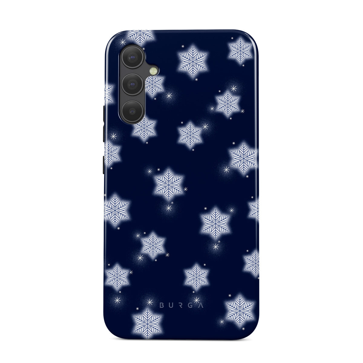 此設計特色:白色雪花,深藍色背景,冬季雪花圖案,幾何雪花,經典冬季設計