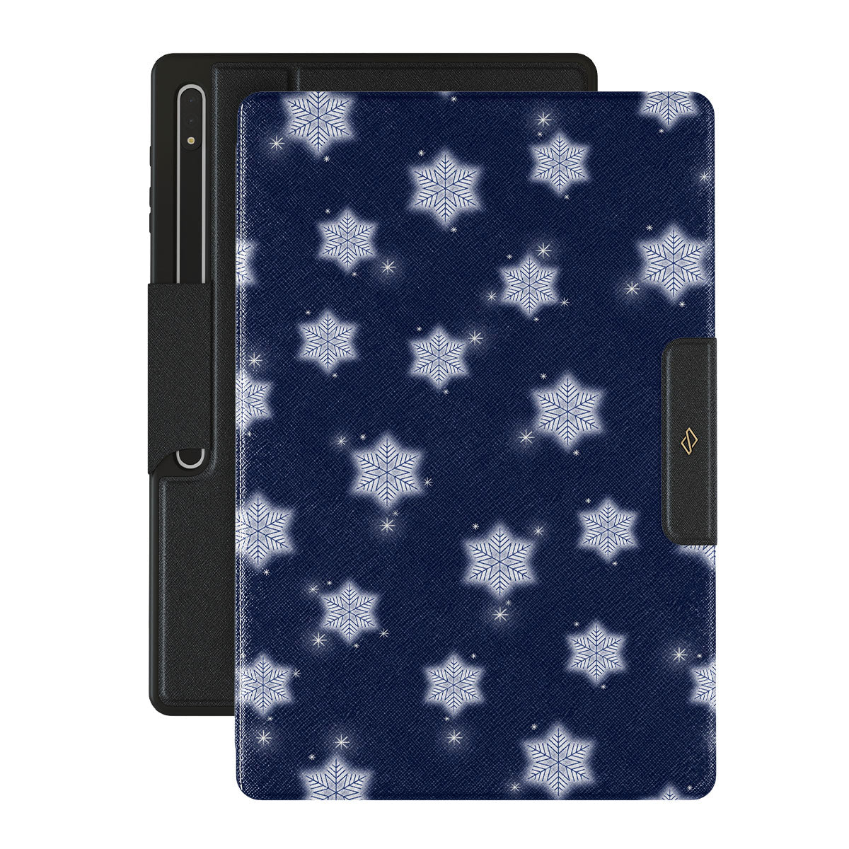 此設計特色:白色雪花,深藍色背景,冬季雪花圖案,幾何雪花,經典冬季設計