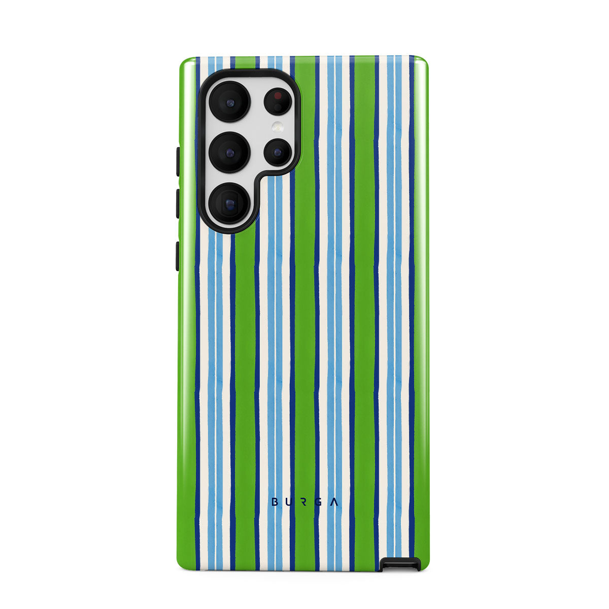 此設計特色: 绿色、蓝色和白色的纵向条纹