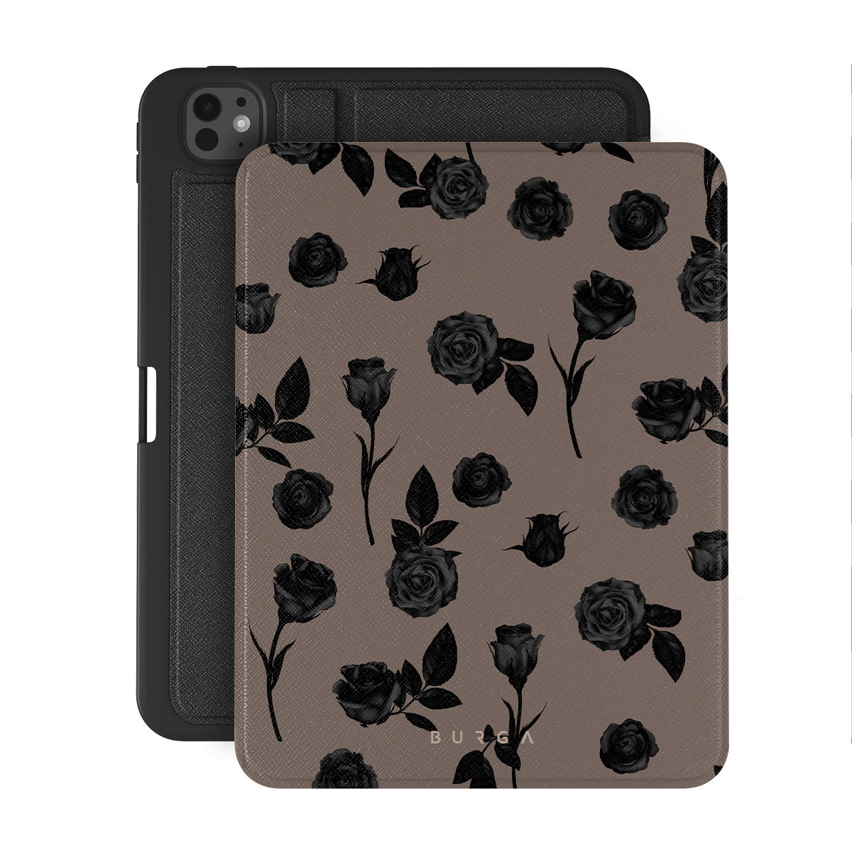 此設計包含:黑玫瑰、大地色調、花卉細節、深色花朵。
