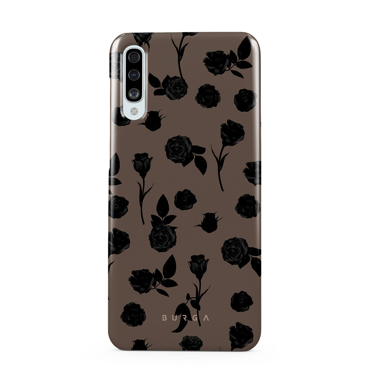 此設計包含:黑玫瑰、大地色調、花卉細節、深色花朵。