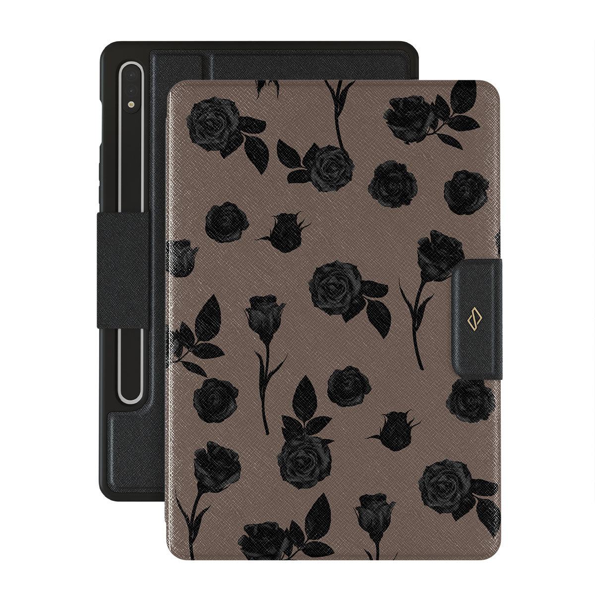 此設計包含:黑玫瑰、大地色調、花卉細節、深色花朵。