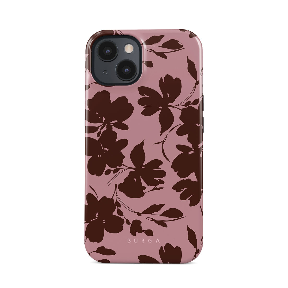 此設計特色包括:抽象棕色花朵、粉紅色背景