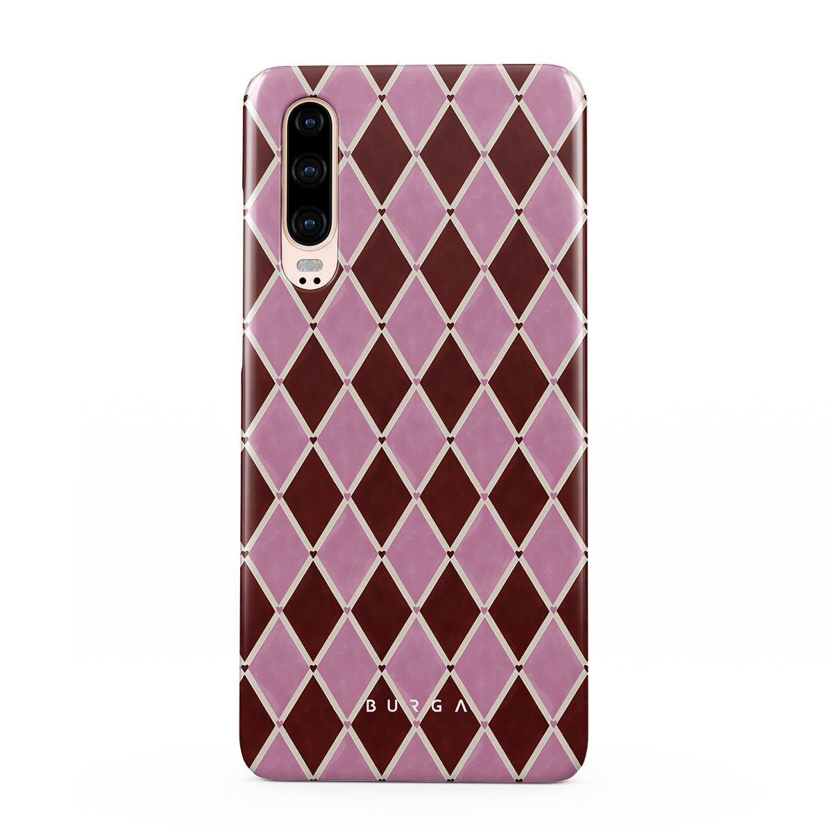 此設計特色: 小丑菱形圖案、粉色鑽石、深紅色背景