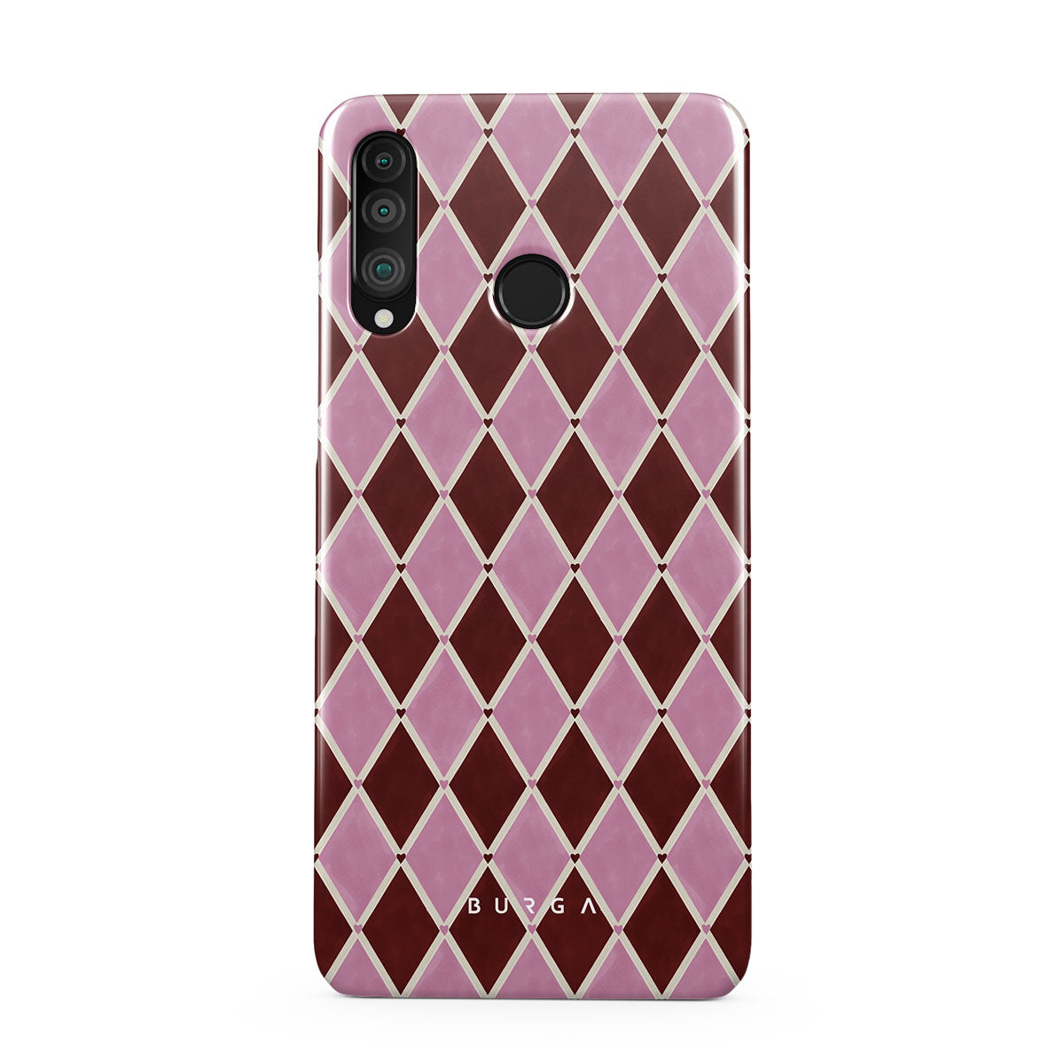 此設計特色: 小丑菱形圖案、粉色鑽石、深紅色背景