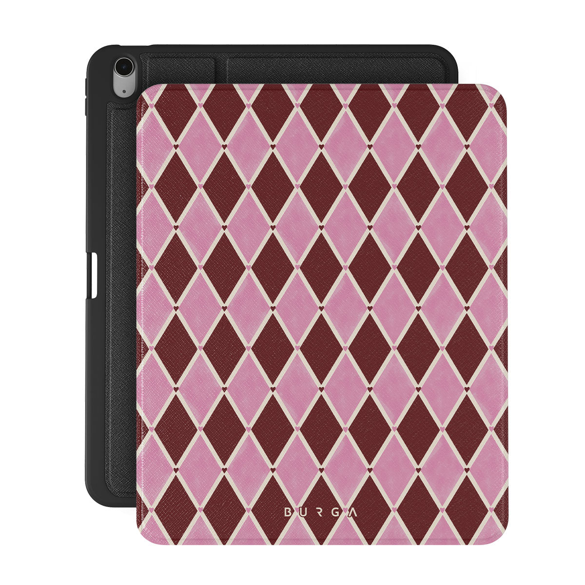 此設計特色: 小丑菱形圖案、粉色鑽石、深紅色背景