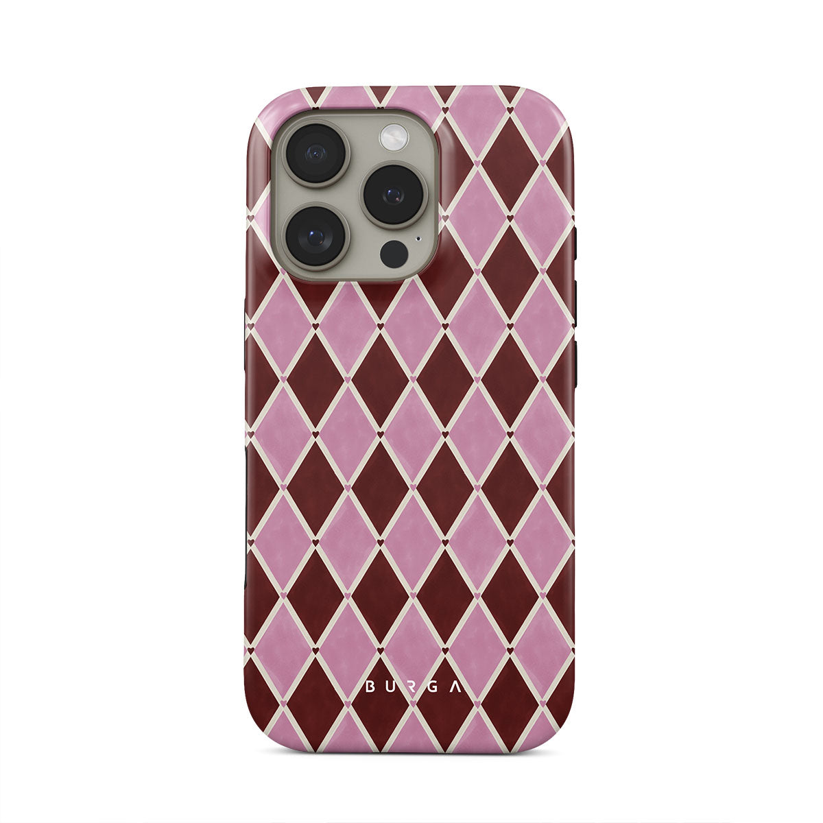 此設計特色: 小丑菱形圖案、粉色鑽石、深紅色背景
