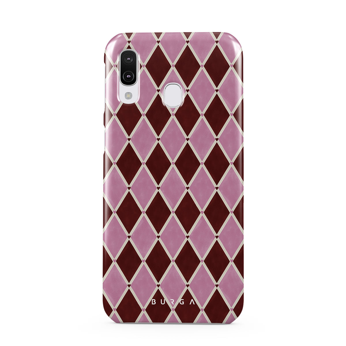 此設計特色: 小丑菱形圖案、粉色鑽石、深紅色背景