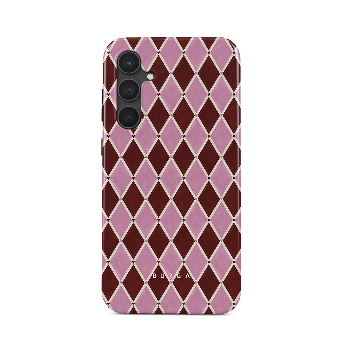 此設計特色: 小丑菱形圖案、粉色鑽石、深紅色背景