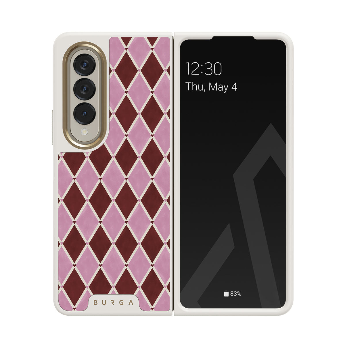 此設計特色: 小丑菱形圖案、粉色鑽石、深紅色背景