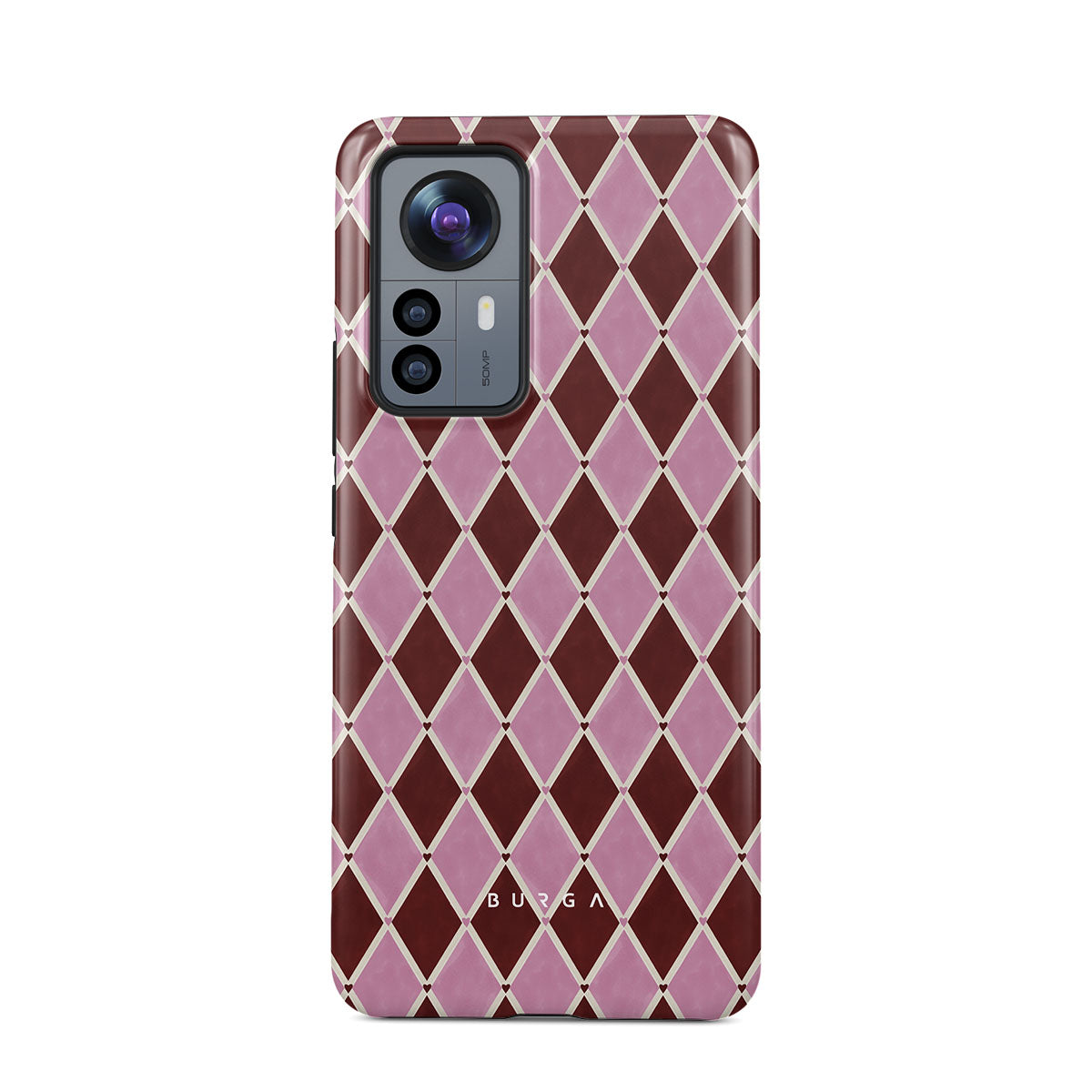 此設計特色: 小丑菱形圖案、粉色鑽石、深紅色背景