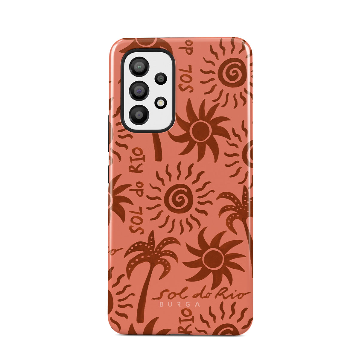 此設計特色: 太陽圖案、棕櫚樹、抽象形狀、溫暖的地球色調