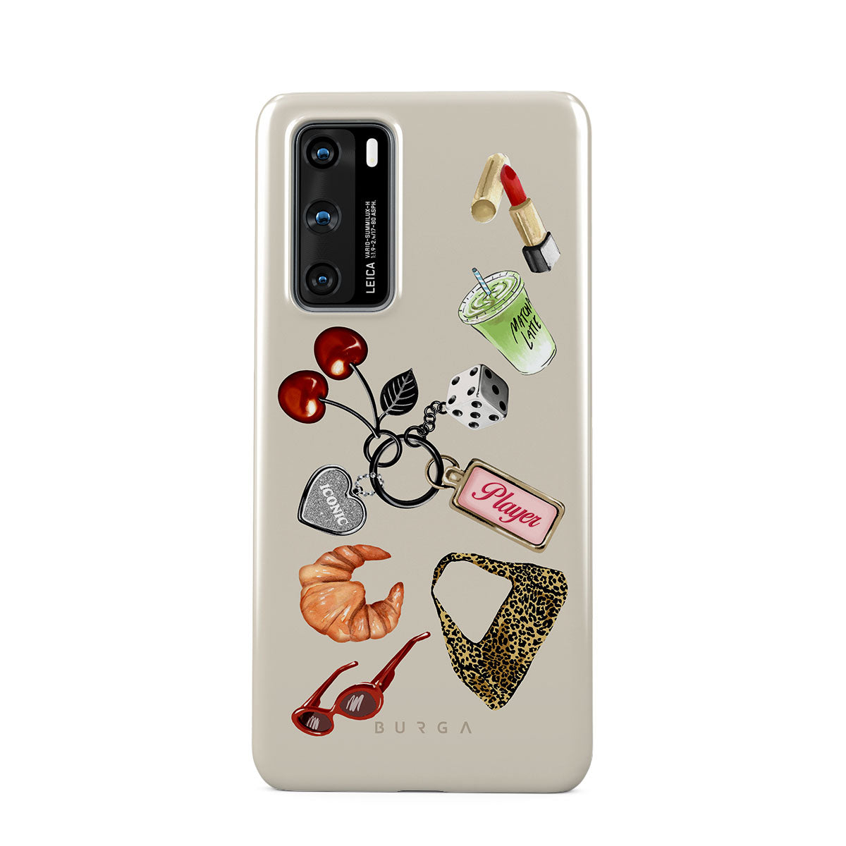 此設計特色:紅色太陽眼鏡、紅色口紅、綠色抹茶飲品、可頌、黑色骰子、豹紋包、銀色愛心鑰匙圈、櫻桃、骰子與「玩家」吊牌