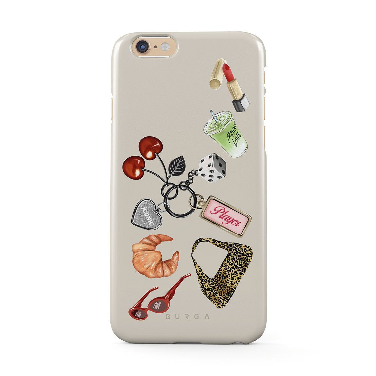 此設計特色:紅色太陽眼鏡、紅色口紅、綠色抹茶飲品、可頌、黑色骰子、豹紋包、銀色愛心鑰匙圈、櫻桃、骰子與「玩家」吊牌