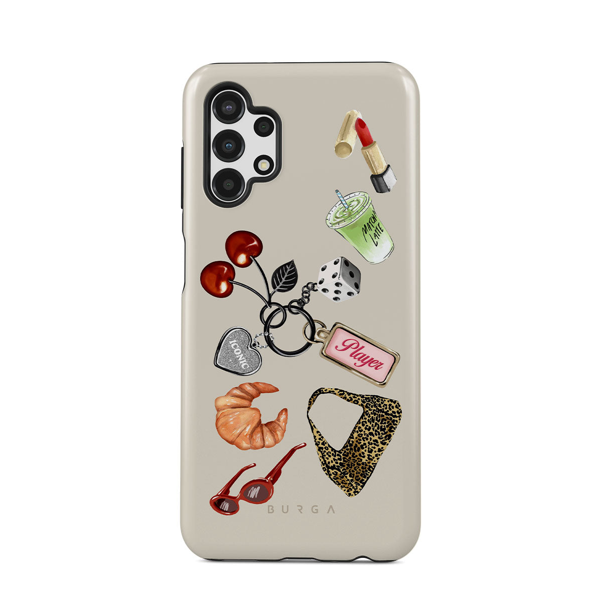 此設計特色:紅色太陽眼鏡、紅色口紅、綠色抹茶飲品、可頌、黑色骰子、豹紋包、銀色愛心鑰匙圈、櫻桃、骰子與「玩家」吊牌