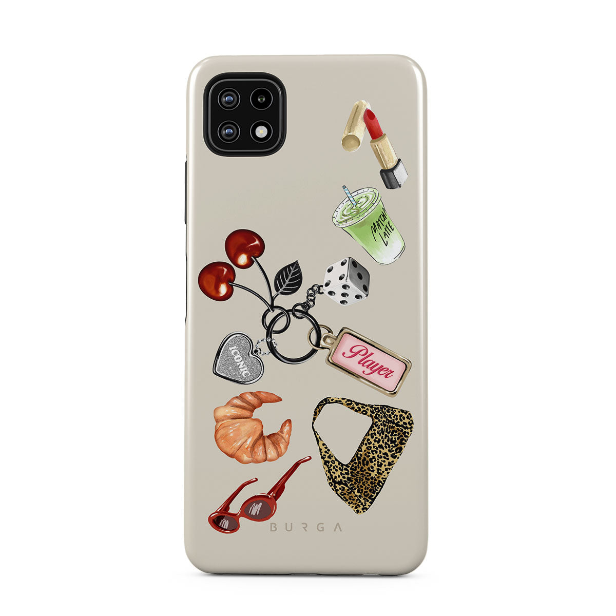 此設計特色:紅色太陽眼鏡、紅色口紅、綠色抹茶飲品、可頌、黑色骰子、豹紋包、銀色愛心鑰匙圈、櫻桃、骰子與「玩家」吊牌