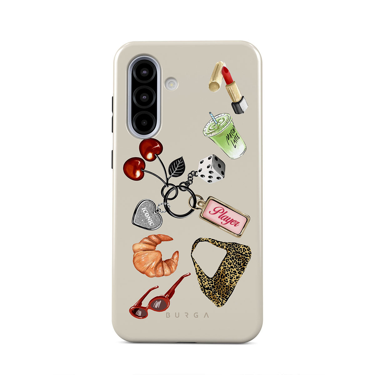 此設計特色:紅色太陽眼鏡、紅色口紅、綠色抹茶飲品、可頌、黑色骰子、豹紋包、銀色愛心鑰匙圈、櫻桃、骰子與「玩家」吊牌