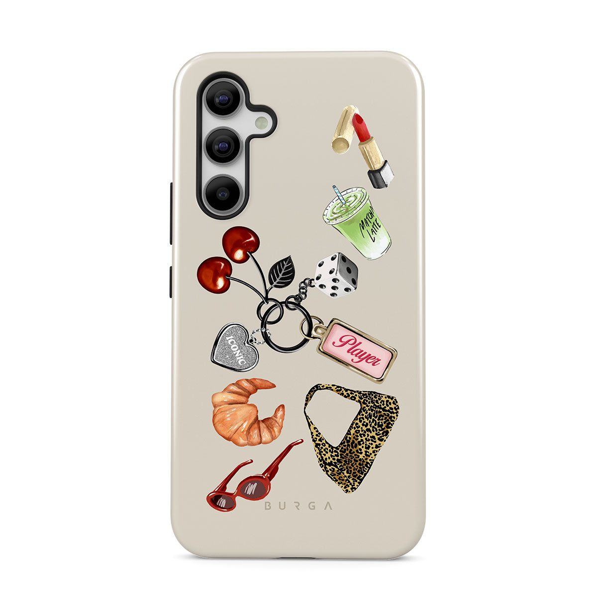 此設計特色:紅色太陽眼鏡、紅色口紅、綠色抹茶飲品、可頌、黑色骰子、豹紋包、銀色愛心鑰匙圈、櫻桃、骰子與「玩家」吊牌