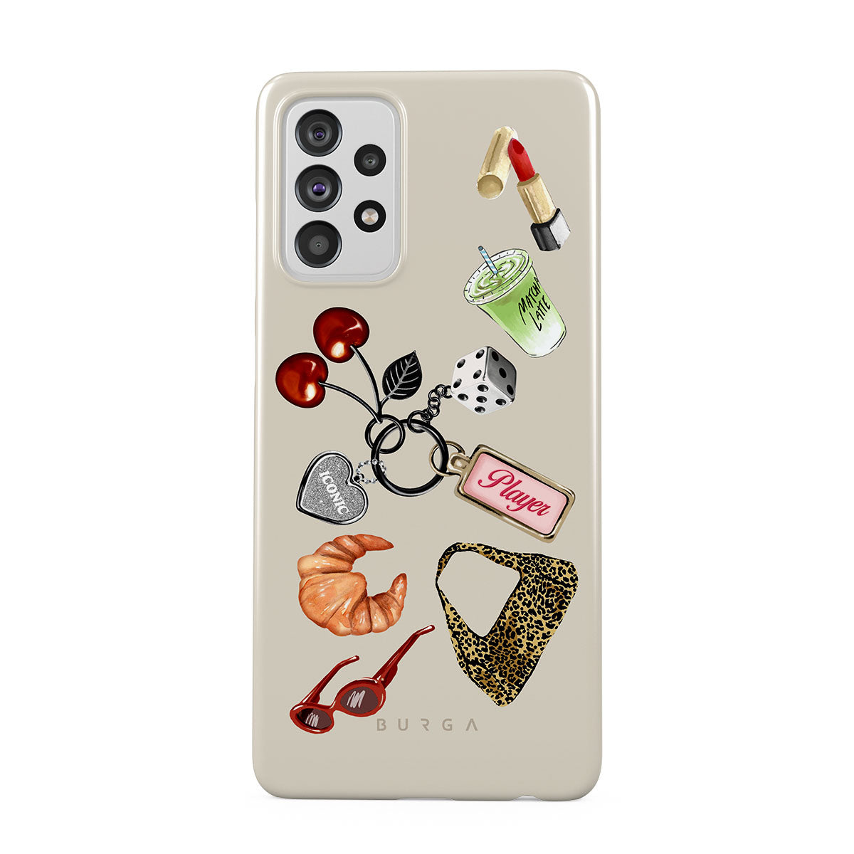 此設計特色:紅色太陽眼鏡、紅色口紅、綠色抹茶飲品、可頌、黑色骰子、豹紋包、銀色愛心鑰匙圈、櫻桃、骰子與「玩家」吊牌