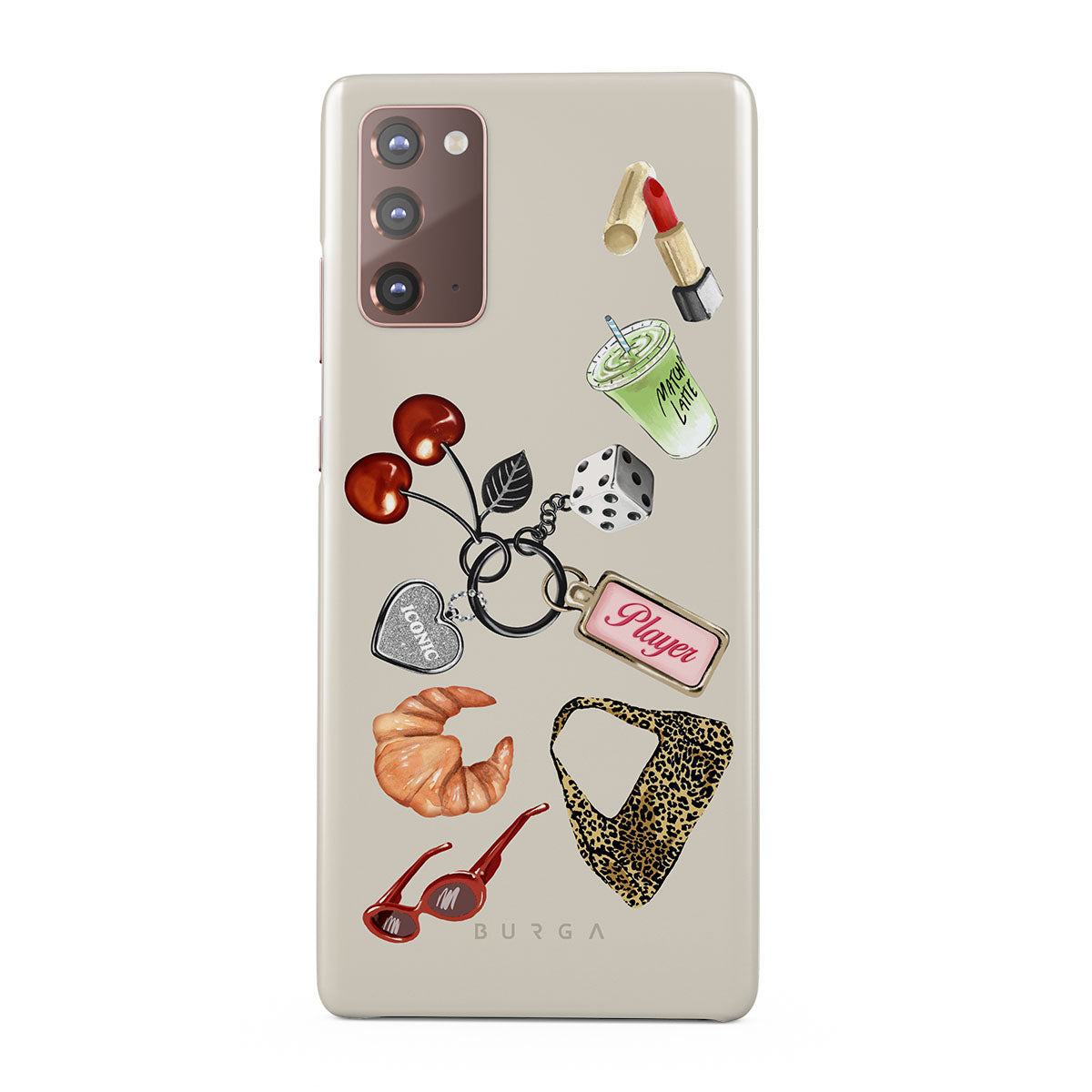 此設計特色:紅色太陽眼鏡、紅色口紅、綠色抹茶飲品、可頌、黑色骰子、豹紋包、銀色愛心鑰匙圈、櫻桃、骰子與「玩家」吊牌