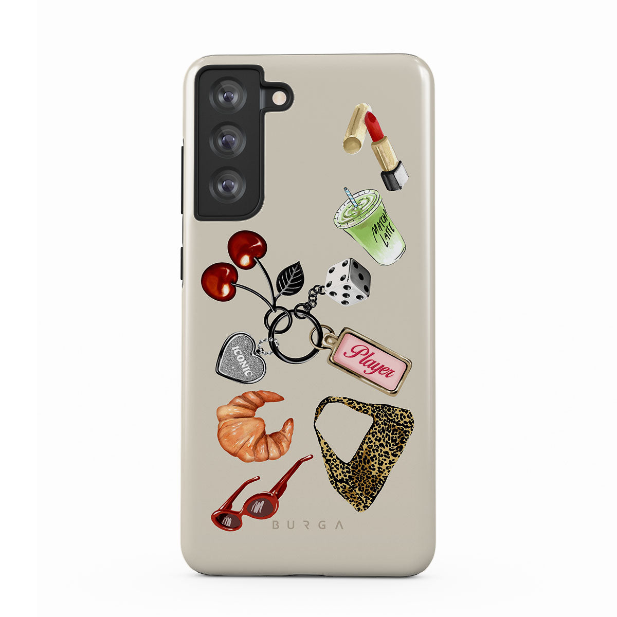 此設計特色:紅色太陽眼鏡、紅色口紅、綠色抹茶飲品、可頌、黑色骰子、豹紋包、銀色愛心鑰匙圈、櫻桃、骰子與「玩家」吊牌