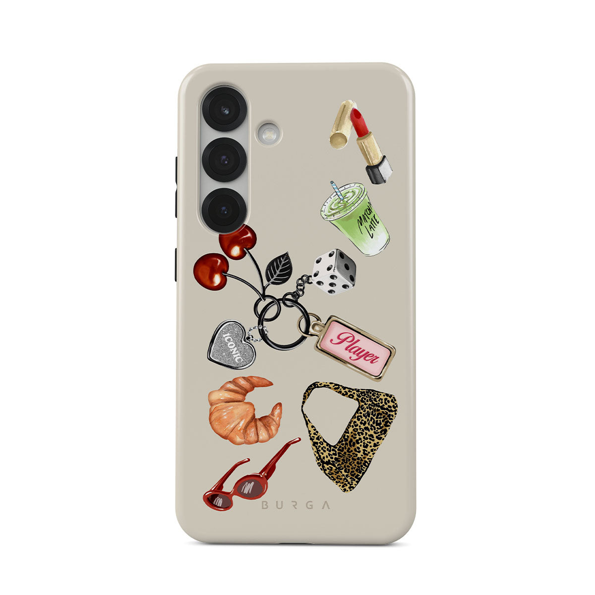 此設計特色:紅色太陽眼鏡、紅色口紅、綠色抹茶飲品、可頌、黑色骰子、豹紋包、銀色愛心鑰匙圈、櫻桃、骰子與「玩家」吊牌