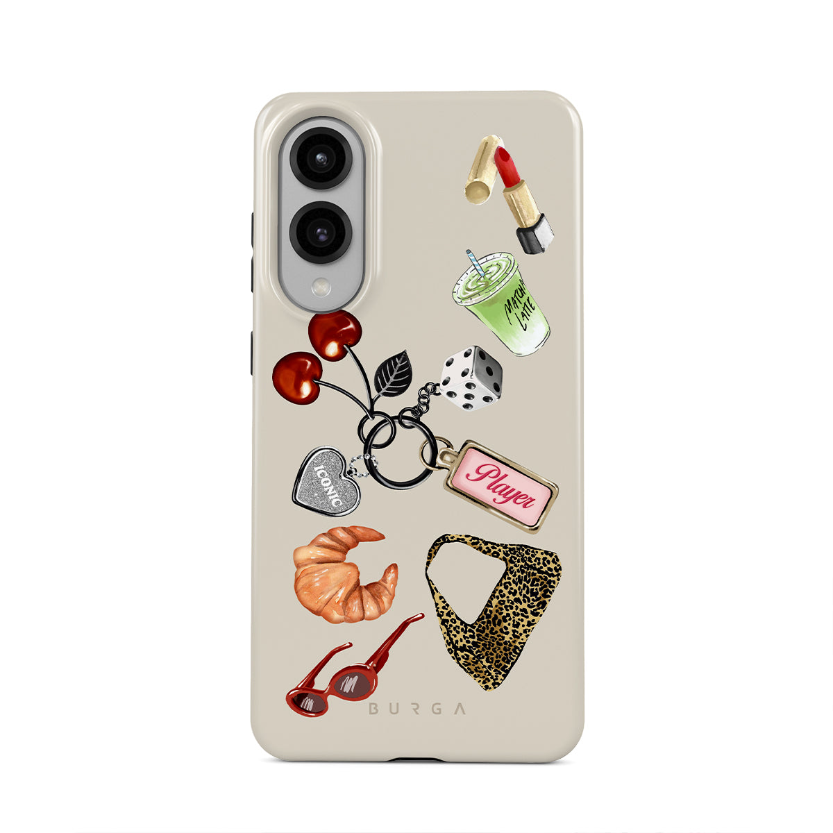 此設計特色:紅色太陽眼鏡、紅色口紅、綠色抹茶飲品、可頌、黑色骰子、豹紋包、銀色愛心鑰匙圈、櫻桃、骰子與「玩家」吊牌