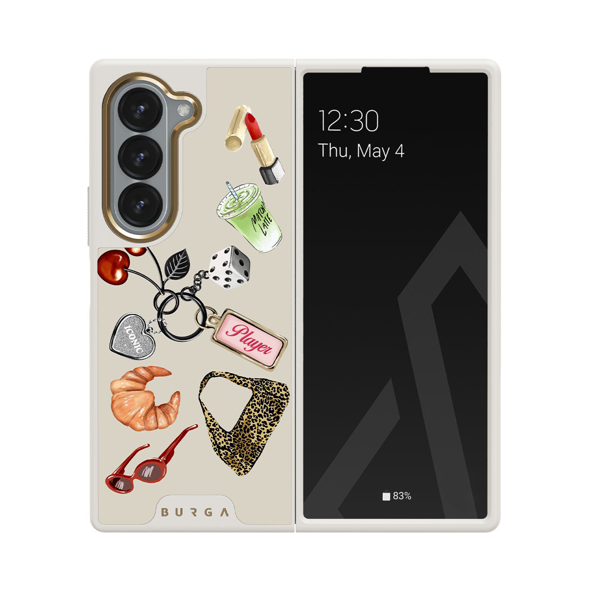 此設計特色:紅色太陽眼鏡、紅色口紅、綠色抹茶飲品、可頌、黑色骰子、豹紋包、銀色愛心鑰匙圈、櫻桃、骰子與「玩家」吊牌