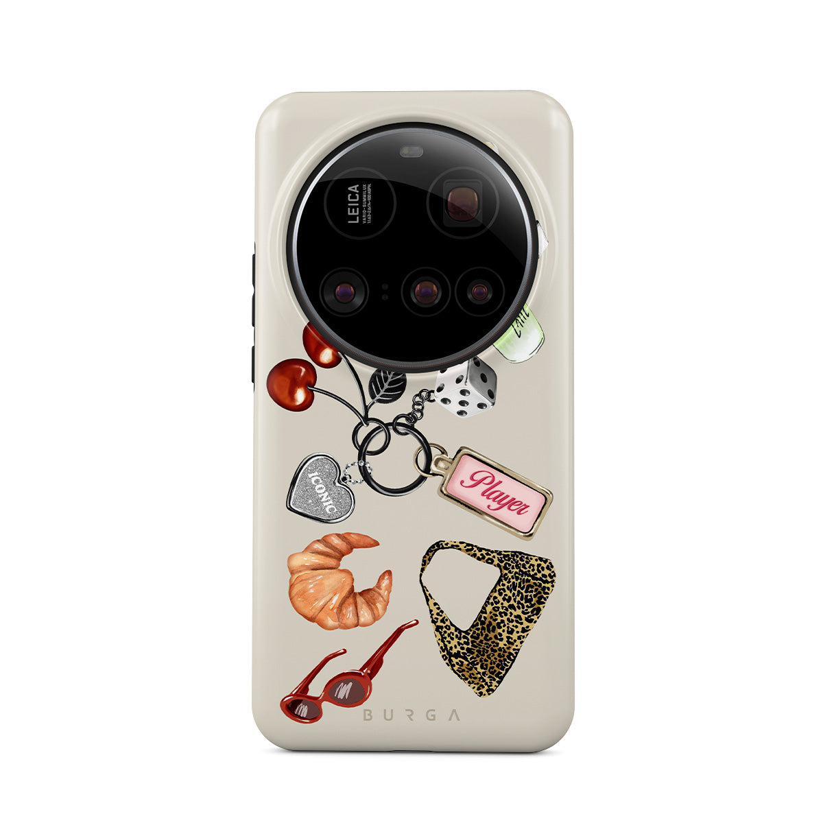 此設計特色:紅色太陽眼鏡、紅色口紅、綠色抹茶飲品、可頌、黑色骰子、豹紋包、銀色愛心鑰匙圈、櫻桃、骰子與「玩家」吊牌
