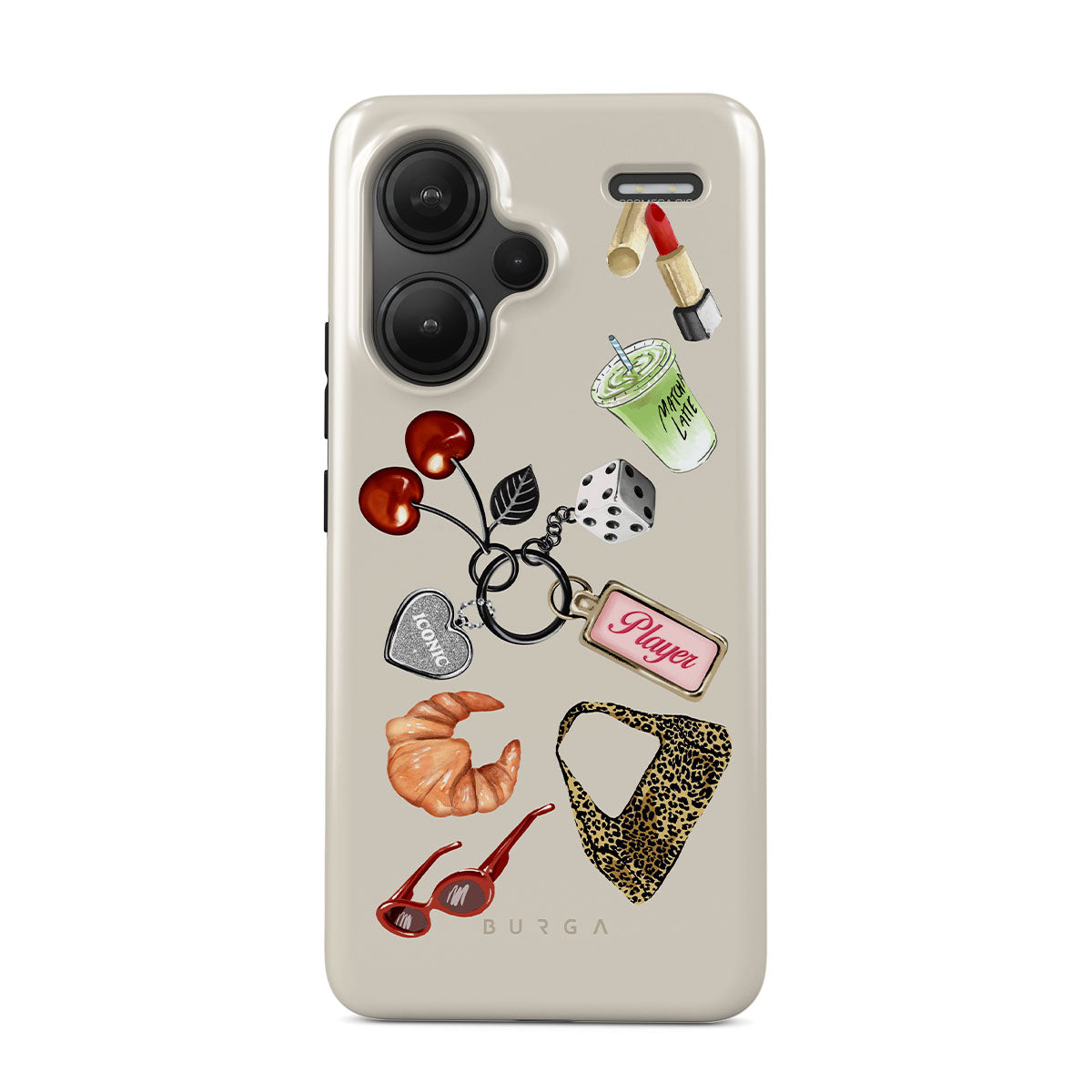 此設計特色:紅色太陽眼鏡、紅色口紅、綠色抹茶飲品、可頌、黑色骰子、豹紋包、銀色愛心鑰匙圈、櫻桃、骰子與「玩家」吊牌