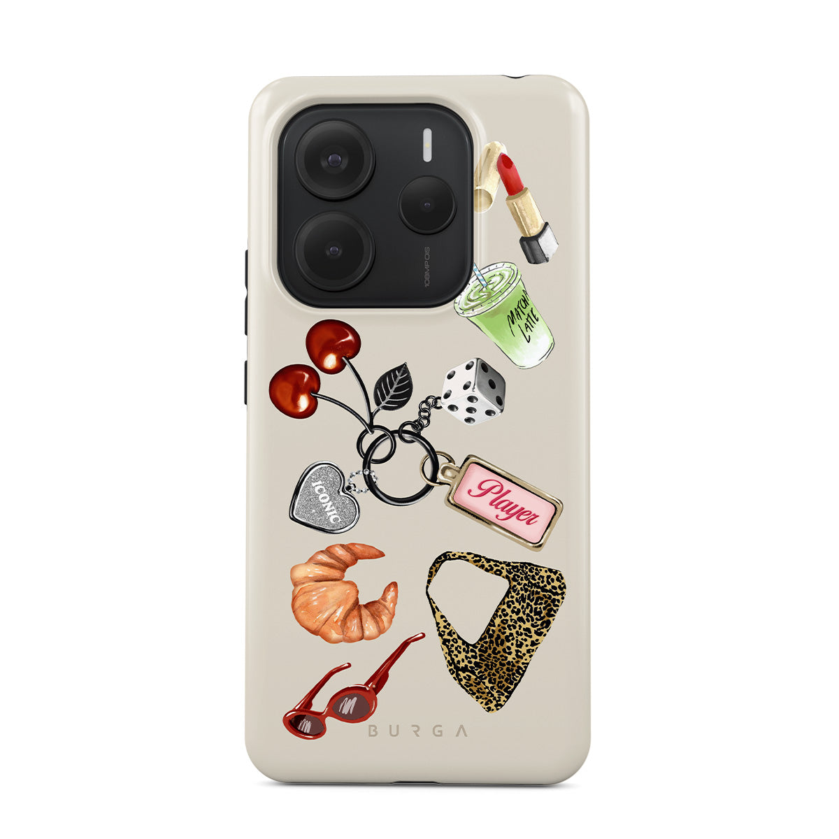 此設計特色:紅色太陽眼鏡、紅色口紅、綠色抹茶飲品、可頌、黑色骰子、豹紋包、銀色愛心鑰匙圈、櫻桃、骰子與「玩家」吊牌