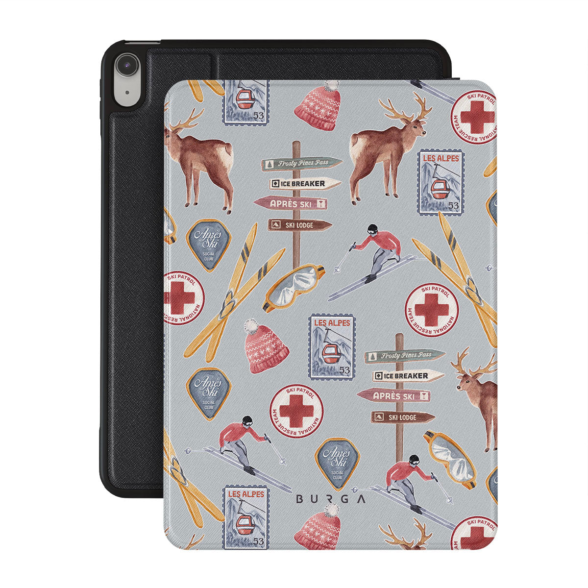 此設計特色:復古滑雪海報,復古滑雪度假村,馴鹿插畫,滑雪纜車設計,阿爾卑斯圖案,冬季運動,經典滑雪小屋風格,山區度假村圖形