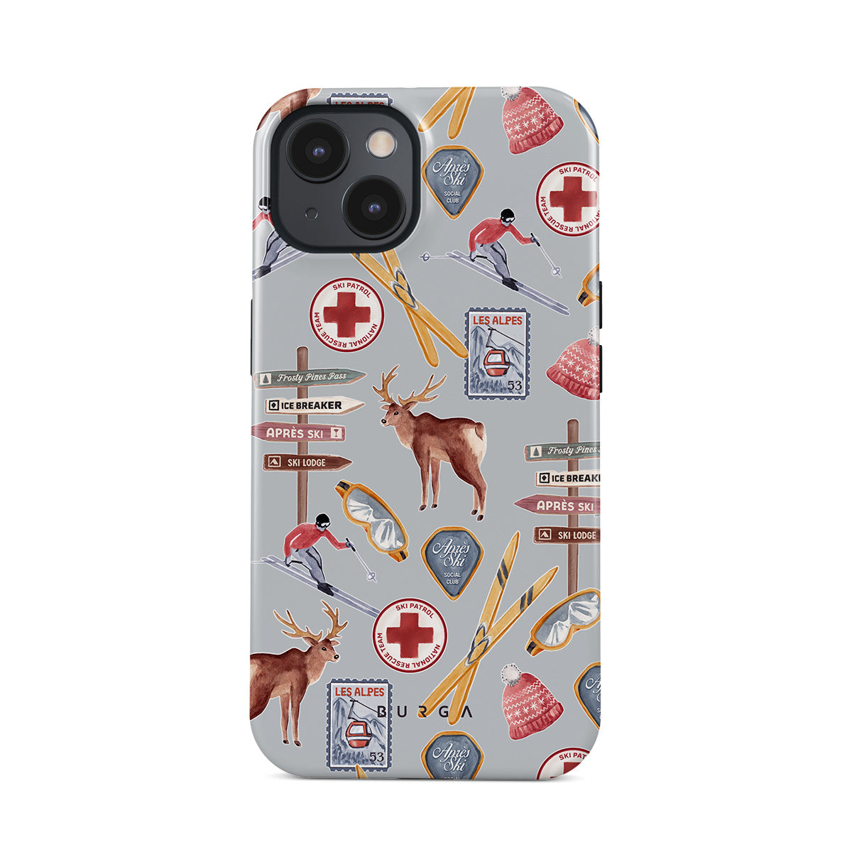此設計特色:復古滑雪海報,復古滑雪度假村,馴鹿插畫,滑雪纜車設計,阿爾卑斯圖案,冬季運動,經典滑雪小屋風格,山區度假村圖形