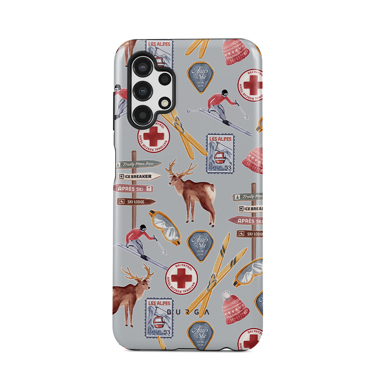此設計特色:復古滑雪海報,復古滑雪度假村,馴鹿插畫,滑雪纜車設計,阿爾卑斯圖案,冬季運動,經典滑雪小屋風格,山區度假村圖形