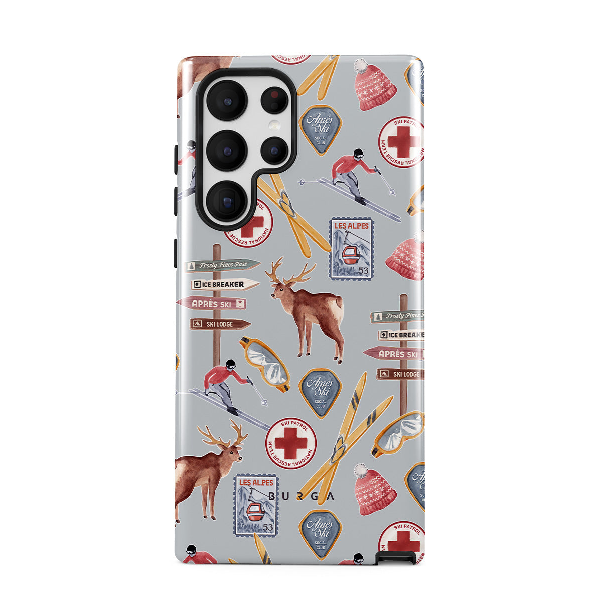 此設計特色:復古滑雪海報,復古滑雪度假村,馴鹿插畫,滑雪纜車設計,阿爾卑斯圖案,冬季運動,經典滑雪小屋風格,山區度假村圖形