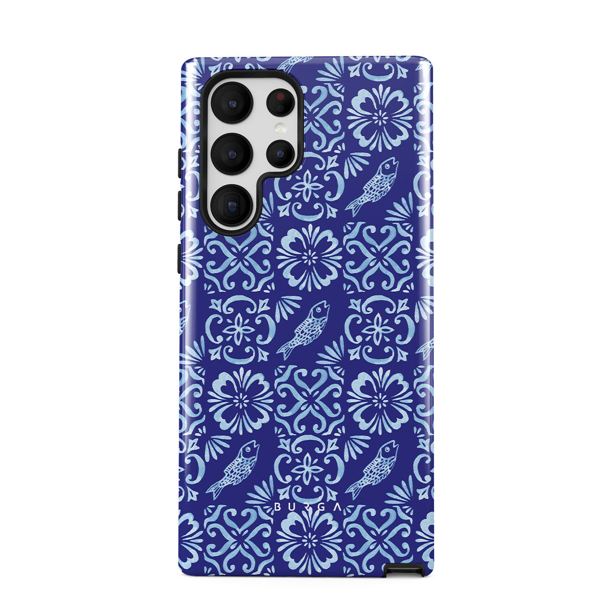 此設計特色: 葡萄牙瓷砖图案,深蓝色,花卉图案,花朵,鱼类