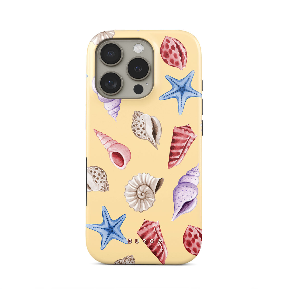 此設計特色:海螺,海星,淡黃色背景,海洋主題