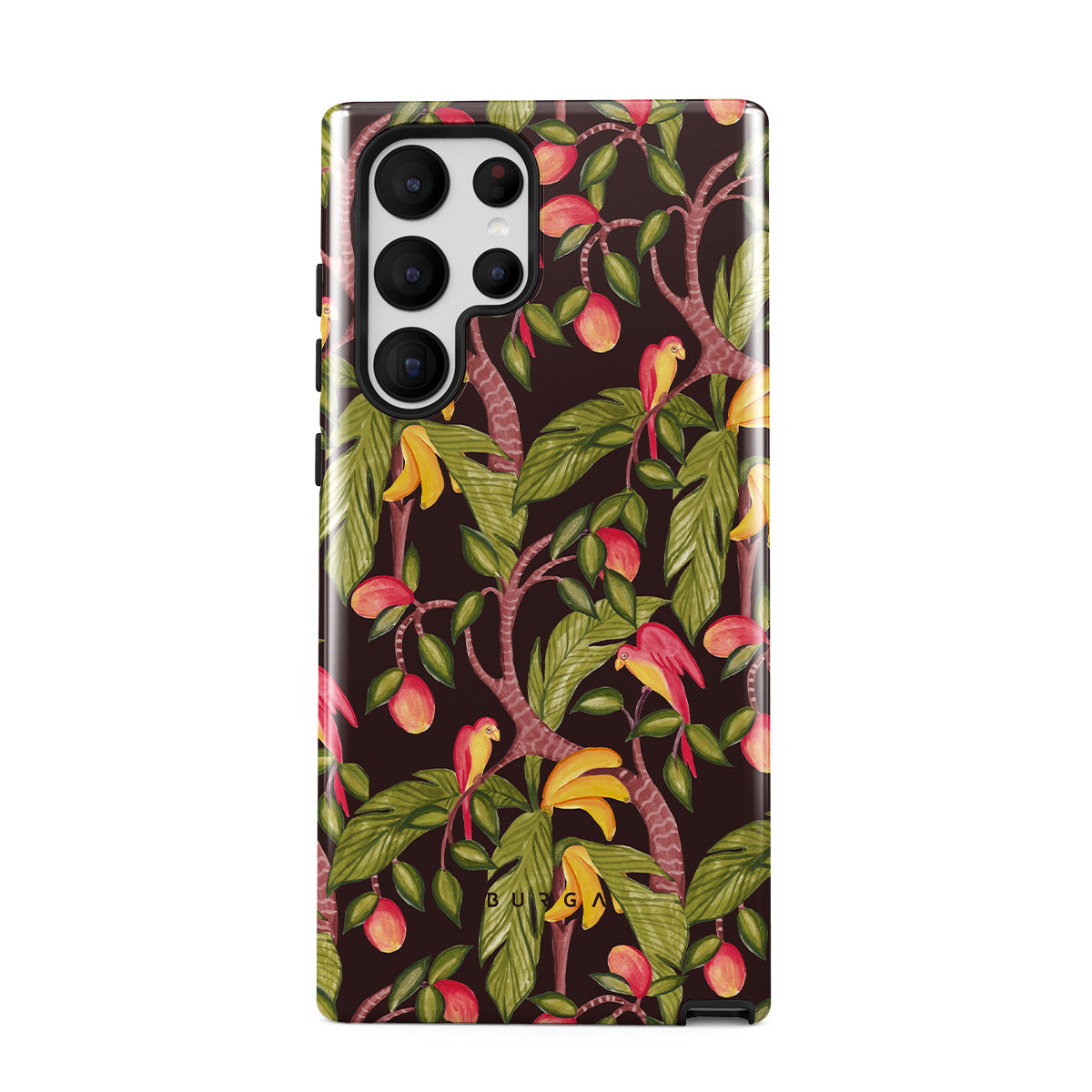 此設計特色: 芒果、深綠色葉片、叢林風格圖案