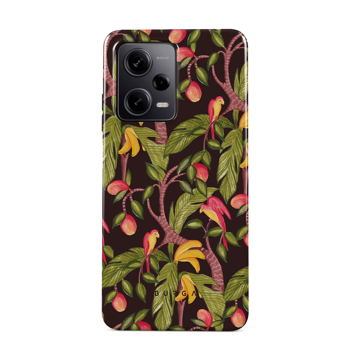此設計特色: 芒果、深綠色葉片、叢林風格圖案
