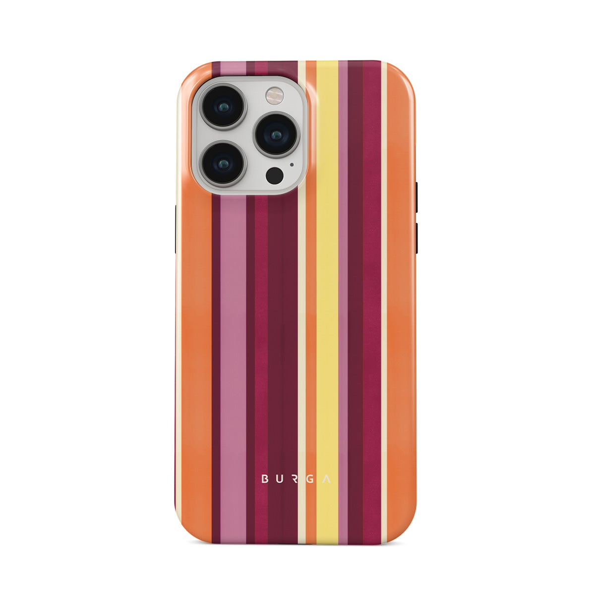 此設計特色: 橙色與紫色條紋、熱情果顏色、熱帶圖案