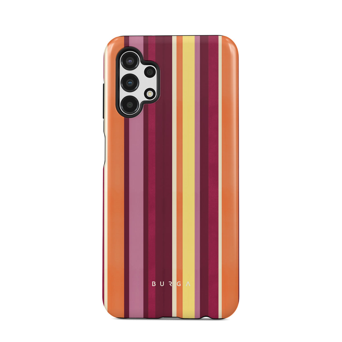 此設計特色: 橙色與紫色條紋、熱情果顏色、熱帶圖案