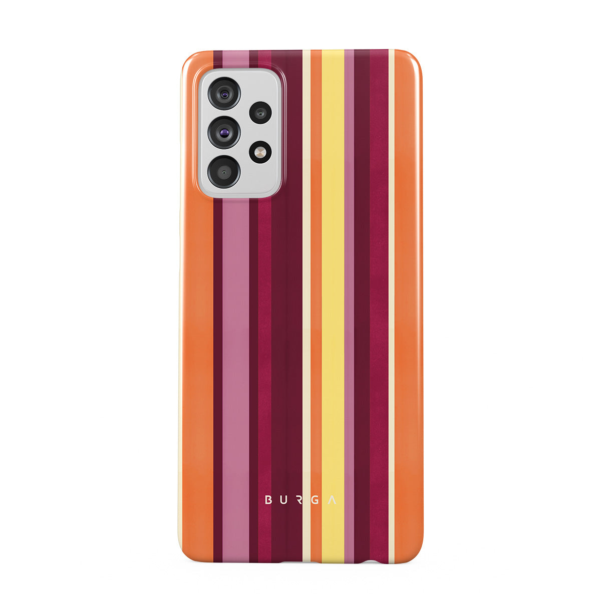 此設計特色: 橙色與紫色條紋、熱情果顏色、熱帶圖案