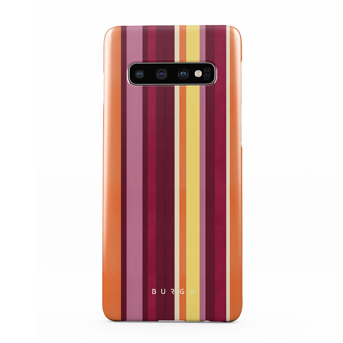 此設計特色: 橙色與紫色條紋、熱情果顏色、熱帶圖案